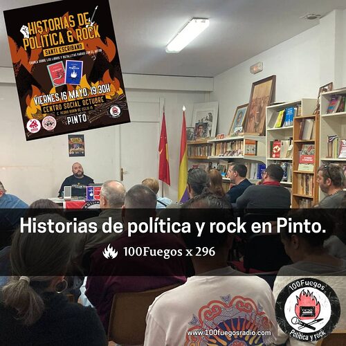 No toca programa convencional, recuperamos el audio de la primera charla «Historias de política y rock», a cargo de Santi Escribano con la excusa de sus libros «La Mecha» (2021) y «La Hoguera» (2024), y que tuvo lugar en el CS Octubre de Pinto, organizado por 100Fuegos y el núcleo de Pinto del PCE, el 16 de mayo de 2025.