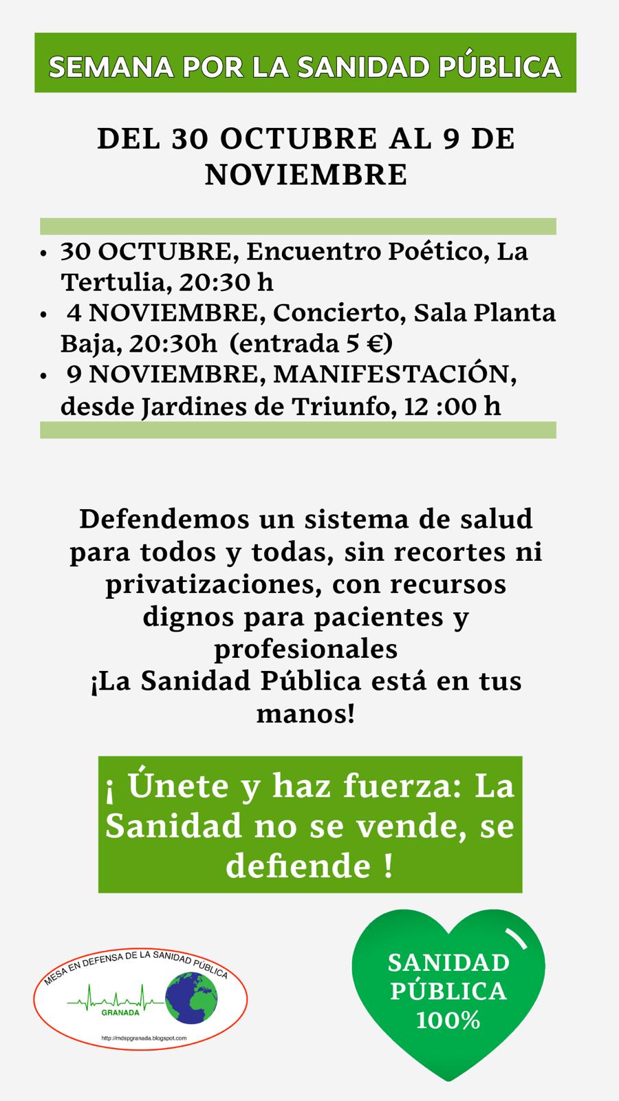 Y nos contarán los eventos principales de la Semana por la Sanidad Pública del 30 de octubre al 9 de noviembre, día en el.que se convoca una manifestación desde las 12 horas en los jardines del Triunfo.