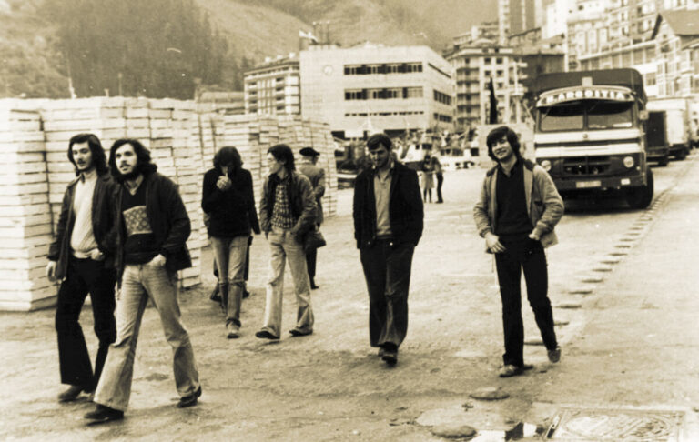 Primera formación de Itoiz: De izquierda a derecha, Joseba Erkiaga, Juan Carlos Pérez, Estanis Osinalde encendiendo un cigarrillo, Matxitxa, manager del grupo, «Foisis» y Antton Fernández. Ondarroa, 1978. © Elkar.