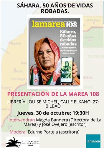 La presentación contó con la presencia de la directora de La Marea, Magda Bandera, y del escritor José Ovejero, coordinador de la sección de cultura «Periscopio» de La Marea, y todo ello moderado por la escritora Edurne Portela. Durante la charla se hace un repaso desde diversas perspectivas a la situación actual del Sahara Occidental. Por el camino también hay tiempo para hablar de cultura y de cómo camina una propuesta cooperativa como La Marea.