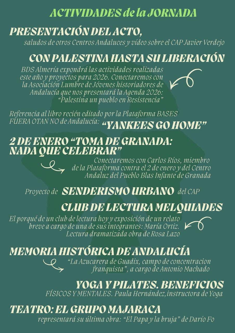En primer lugar te traemos un audio de la breve charla TOMA DE GRANADA: NADA QUE CELEBRAR que tuvo lugar el pasado 2 de enero en el Centro Andaluz del Pueblo «Javier Verdejo» de Almería que impartió el coordinador local de Nación Andaluza en Granada, Carlos Ríos.En el marco de la Jornada de Convivencia realizada en el Centro Andaluz del Pueblo de Almería nuestro coordinador local, Carlos Ríos, realizó una charla on-line desde Granada para los asistentes a esta jornada.