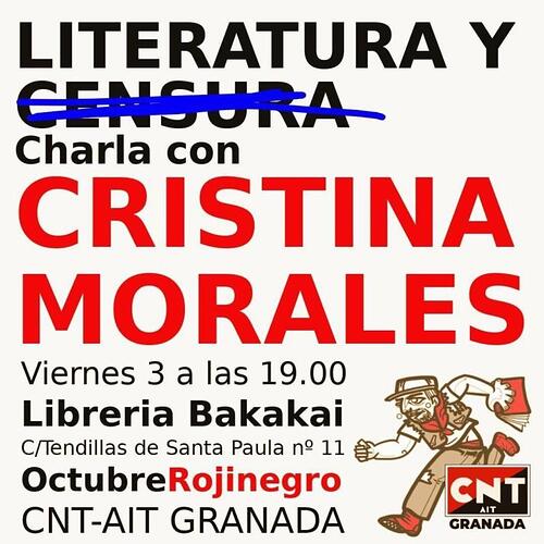 Cristina Morales vino a Granada para participar como conferenciante en el Octubre Rojinegro de CNT-AIT Granada. El tema: Literatura y Censura. Nos explicó cómo funciona el mundo editorial y cómo se intenta controlar lo que se publica, lo logren o no. Nos relató algunos tipos de censura y el contexto social y económico que lo hace posible. Y nos dio detalles personales para ilustrar sus explicaciones. Cristina Morales es una novelista con numerosos premios nacionales e internacionales que trata problemáticas sociales como la vivienda, la salud mental o la violencia. Quienes militamos podemos reconocer, entre líneas y situaciones más o menos jocosas, dinámicas que hemos visto en asambleas y espacios sociales de todo tipo, en especial en el anarquismo y feminismo. Su libro más reconocido es Lectura Fácil, cuyo título original es la famosa pintada callejera que aparece en la portada: Ni Dios, ni amo, ni marido ni partido de fútbol. Pero destacan otras obras como Terroristas Modernos o Últimas tardes con Teresa de Jesús.
