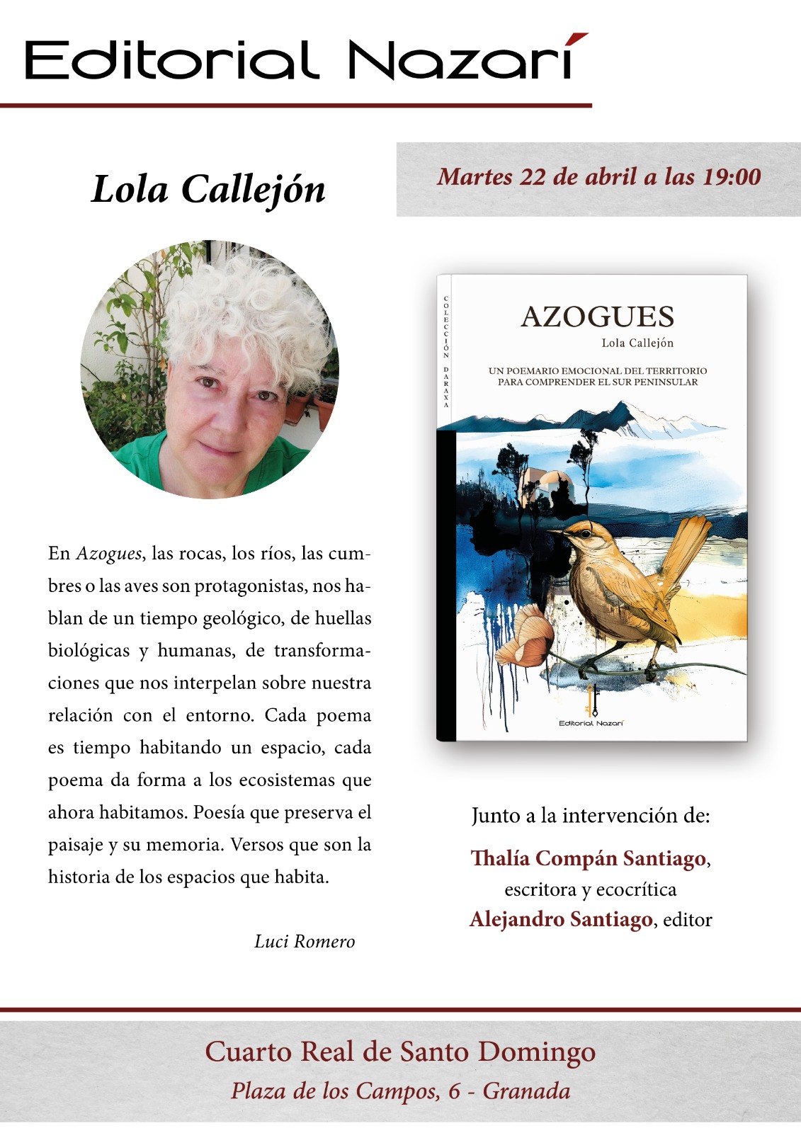 Lola Callejón nos lleva más allá de la simple evocación del paisaje. Versos que son la historia de los espacios que habita. En Azogues, las rocas, los ríos, las cumbres o las aves son protagonistas, nos hablan de un tiempo geológico, de huellas biológicas y humanas, de transformaciones que nos interpelan sobre nuestra relación con el entorno.