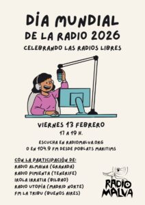 Celebramos el Día Internacional de la radio 2026 poniendo el micro a radios libres de todo el estado, Latinoamérica y compañeros históricos de esta casa, Radio Malva. Estuvimos charlando durante más de dos horas sobre varios temas que nos atraviesan: ¿qué papel tienen las radios libres en el siglo XXI? ¿Qué temas están tratando y cómo? ¿Cómo sirven de transformador a colectivos y personas muy diversas? ¿A qué retos nos enfrentamos? ¿Cómo afrontamos el futuro? Nos acompañaron compañerxs de Radio Malva, actuales e históricos: Piro, Emilia, Toni y Pau. Y conversamos con las radios libres amigas Radio Almaina (Granada), Irola Irratia y 97 Irratia (Bilbao), FM La Tribu (Buenos Aires), Radio Utopía (Madrid Norte) y Radio Pimienta (Tenerife). Gracias a todxs lxs que seguís haciendo de la comunicación un derecho humano a través de las ondas. El programa fue producido y conducido por Penélope y Miguel, de Radio Malva.